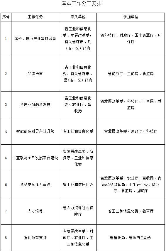 (一)加大项目推进力度。省直有关部门按照职责分工做好相关工作。省级重点抓龙头,市级重点抓基地,县级重点抓特色,省、市、县三级要在产业布局、项目建设、集群集聚、链条完善、政策资金扶持等方面凝聚合力,协调联动,强力推进。
