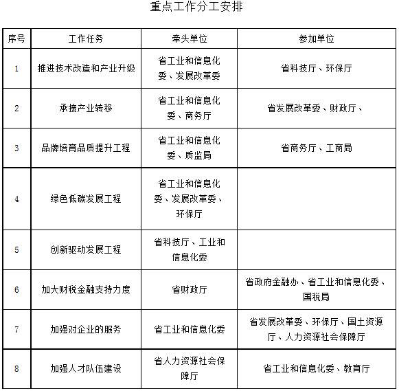 (一)加强组织领导。组织引导各级政府和有关部门,建立省、市、县三级产业发展联动机制,在产业布局、项目建设、集群集聚、链条完善、政策资金扶持等方面,协调配合、共同支持高端装备产业发展,促进产业转型升级,为企业发展创造良好环境。