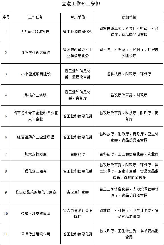 (一)加强组织领导。建立省、市、县三级产业发展联动机制,明确职责分工,强化工作责任落实;加大协调力度,加快年度工作计划的组织实施,合力推进产业发展。在政策推动、产业布局、集群集聚、链条完善、优秀人才和项目引进、国际交流与合作、项目执行、药品采购、资金和市场运作、产业联盟建设等方面凝聚合力,协调联动,强力推进。