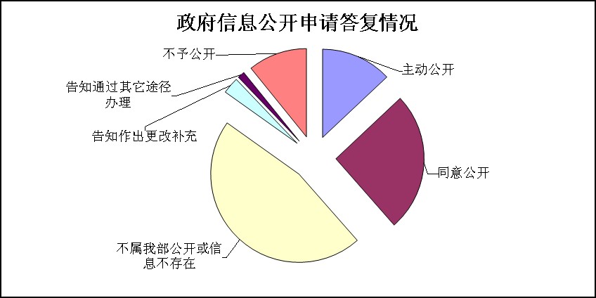 2015年我部受理的169件政府信息公开申请,均已按照《条例》规定办结。其中,通过信函答复168件,自行领取1件。231项申请内容中,已主动公开30项,同意公开59项(含2项部分公开),不属我部公开或信息不存在107项,告知作出更改补充7项,告知通过其它途径办理3项,不予公开25项(因涉及国家秘密或国家安全5项,因涉及商业秘密或个人隐私2项,因非《条例》定义的政府信息18项)。