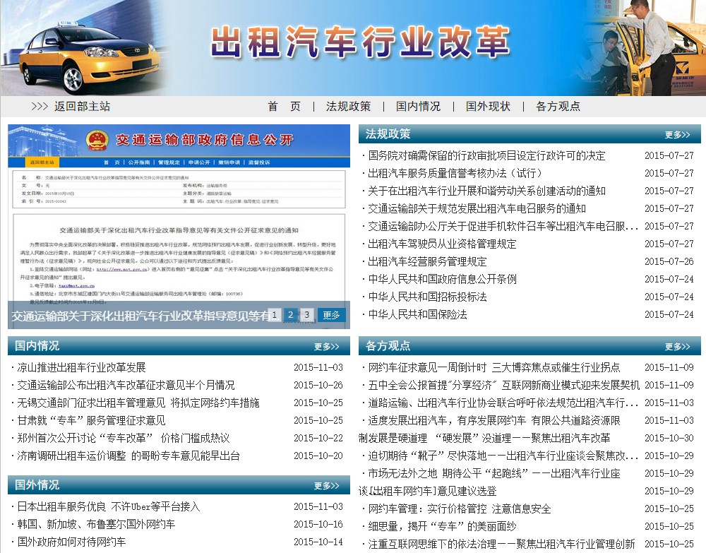 二是在制定出租汽车改革措施方面,在会同有关部门多次组织社会各界召开出租汽车行业改革专题座谈会和研讨会的基础上,起草了《关于深化改革进一步推进出租汽车行业健康发展的指导意见(征求意见稿)》和《网络预约出租汽车经营服务管理暂行办法(征求意见稿)》两个文件,于2015年10月10日通过国务院法制办和部政府网站向社会公开征求意见,并先后三次通过部政府网站、中国交通报向社会公布公开征求意见情况。在部政府网站开设了“出租汽车行业改革”专栏,对相关政策法规和国内外出租汽车行业改革、管理、市场运行动态以及专家观点等进行集中展示。