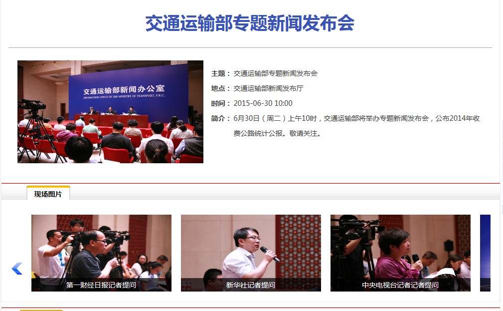 一是在强化收费公路信息公开方面,组织指导全国29个省(区、市)陆续发布了2014年收费公路统计公报。在各地公报发布的基础上,我部汇总整理了2014年全国收费公路统计信息,于2015年6月30日召开新闻发布会,正式发布了《2014年全国公路收费统计公报》,并就公报所反映的信息和数据进行了解读。