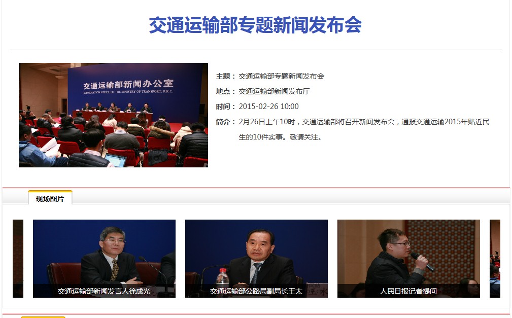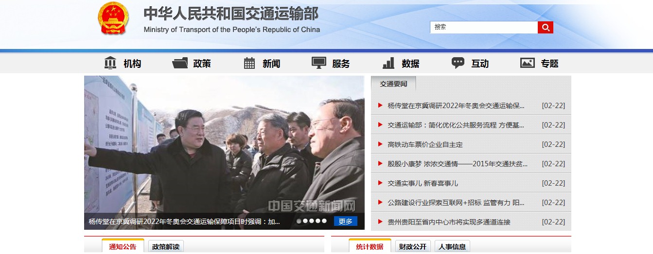 1.2015年我部累计在中国政府网“部长之声”专栏发布17期30例部领导重要讲话,发布政策解读信息8条。通过部政府网站对《航道法》《汽车维修技术信息公开实施管理办法》《关于加强交通运输行业信用体系建设的若干意见》《交通运输部关于全面深化交通运输改革的意见》《2015年“道路客运安全年”活动方案》等社会关切热点以及需要公众广泛知晓的相关法律、法规、规章、规定、意见等进行了解读。举办了40期在线访谈,通过部政府网站组织在线访谈,由部机关及交通运输系统单位相关负责同志就交通运输重点工作开展情况、部政府网站改版情况等向网民做介绍,并与网民在线互动交流。