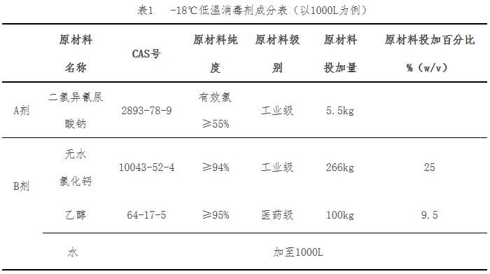 (一)低温消毒剂(-18℃)。包括二氯异氰尿酸钠、氯化钙和乙醇。现场使用时,-18℃低温消毒剂中有效氯浓度为0.3%(3000mg/L),无水氯化钙的含量为25%,乙醇的含量为9.5%。详见表1。