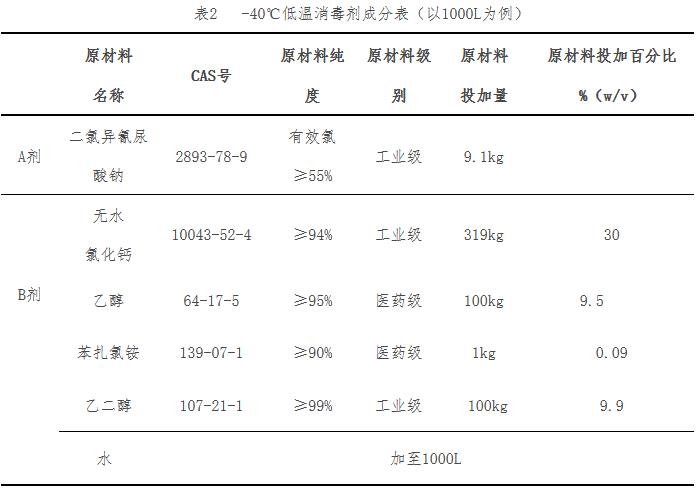 (二)低温消毒剂(-40℃)。包括二氯异氰尿酸钠、氯化钙、乙醇、乙二醇和苯扎氯铵。现场使用时,-40℃低温消毒剂中有效氯浓度为0.5%(5000mg/L),无水氯化钙的含量为30%,乙醇9.5%,乙二醇9.9%,苯扎氯铵0.09%。详见表2。