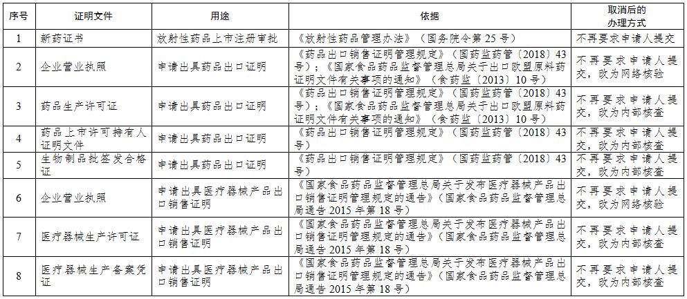根据《国务院办公厅关于做好证明事项清理工作的通知》(国办发〔2018〕47号)要求,为进一步减证便民、优化服务,国家药品监督管理局决定取消8项证明事项(详见附件),现予以发布。附件所列证明事项自本公告发布之日起停止执行。