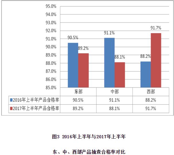(二)从抽查地区分布来看,东部地区抽查产品数量较多,共抽查2205批次,占抽查产品总数的82.5%;中、西部地区分别抽查了257批次和212批次,占抽查产品总数的9.6%和7.9%。随着我国实施“一带一路”战略,西部抽查产品质量水平出现了大幅提升,西部地区产品抽查合格率为91.7%,高于国家监督抽查全国平均水平1个百分点;东部地区产品抽查合格率为89.2%,低于国家监督抽查全国平均水平1.5个百分点;中部地区产品抽查合格率为88.1%,低于国家监督抽查全国平均水平2.6个百分点。与2016年同期相比,西部地区抽查合格率提高了3.5个百分点,东部和中部地区分别下降了1.3和3个百分点。2017年上半年与2016年同期东部、中部、西部产品抽查合格率对比情况见图3。