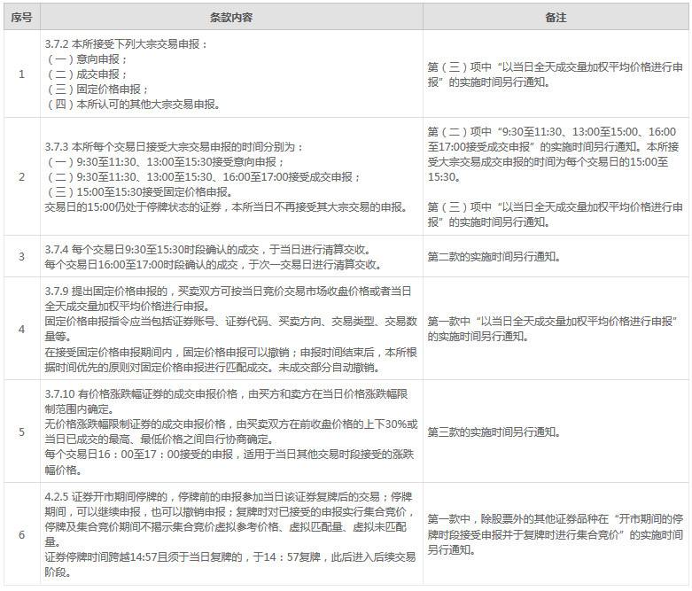 考虑到市场及会员业务技术准备情况,本次修订中的以下条款或其部分内容暂缓实施,将待完成相关技术开发和测试后实施,具体时间由本所另行通知。具体内容如下: