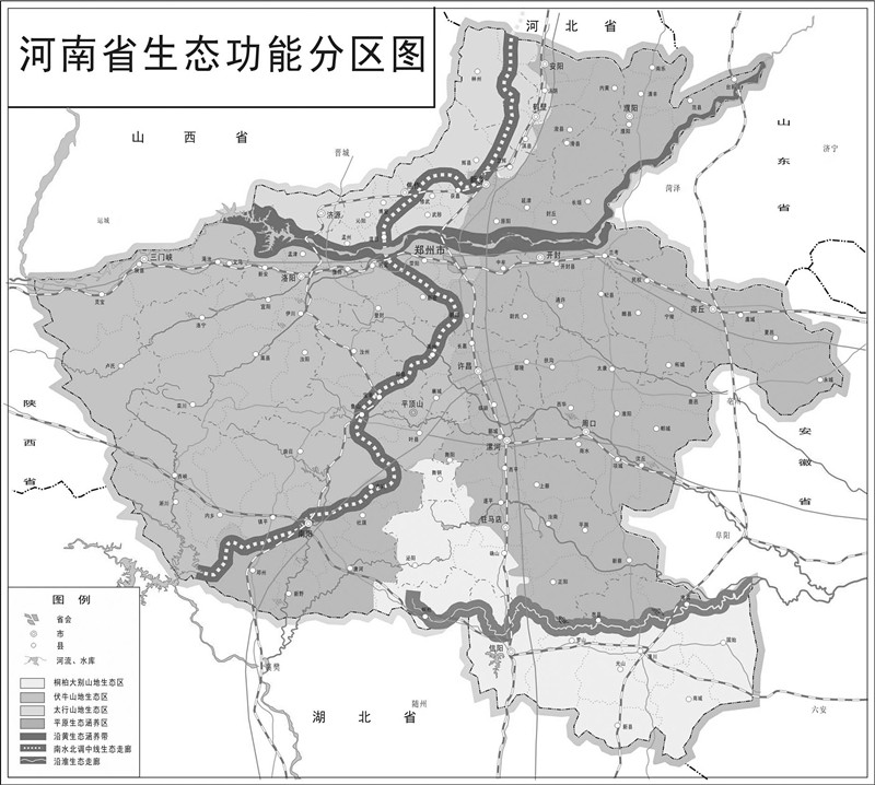 推进建设桐柏大别山地生态区、伏牛山地生态区、太行山地生态区、平原生态涵养区,构建横跨东西的沿黄生态涵养带、沿淮生态走廊和纵贯南北的南水北调中线生态走廊,形成“四区三带”的区域生态格局。
