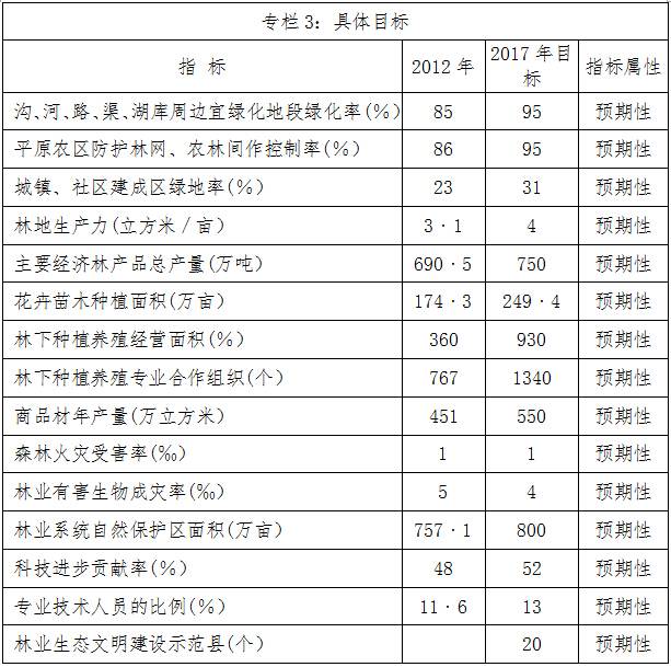 到2020年,全省森林面积达到6300万亩,森林覆盖率达到25%以上,森林蓄积量达到19500万立方米以上,林业产业年总产值达到2300亿元以上,形成销售收入10亿元以上的林业产业化集群75个,森林植被总碳储量力争达到11400万吨以上,年林业生态效益价值达到6600亿元以上,农民来自林业的纯收入平均达到1200元。