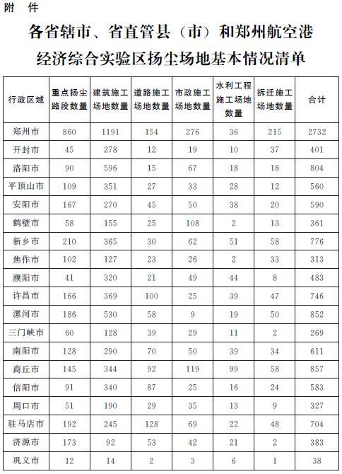 附件:各省辖市、省直管县(市)和郑州航空港经济综合实验区扬尘场地基本情况清单