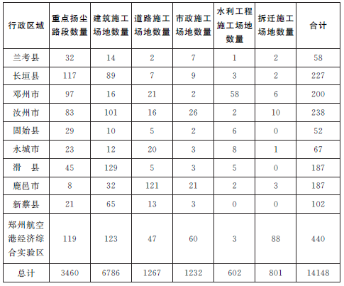 1.工作任务。针对全省各级、各部门排查上报的6786个建筑施工场地、1267个道路施工场地、1232个市政施工场地、801个拆迁施工场地、602个水利施工场地等总计10688个施工场地,以及各地进一步排查的所有施工工地,各省辖市、县(市、区)政府和住房城乡建设、交通运输、国土资源、水利、规划等相关部门以及乡镇政府和街道办事处,均要依据法定管理职责和权限,与主管领域或辖区内施工单位签订扬尘污染治理责任书,监督施工单位按照规定标准、治理措施和时限,完成各项治理目标任务。特别是对连霍高速河南段、京港澳高速河南段等改扩建高速区段和高铁在建区段等大型道路建设施工工地,要实施重点监督管理。