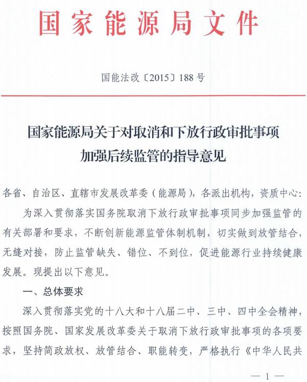 国能法改〔2015〕188号《国家能源局关于对取消和下放行政审批事项加强后续监管的指导意见》