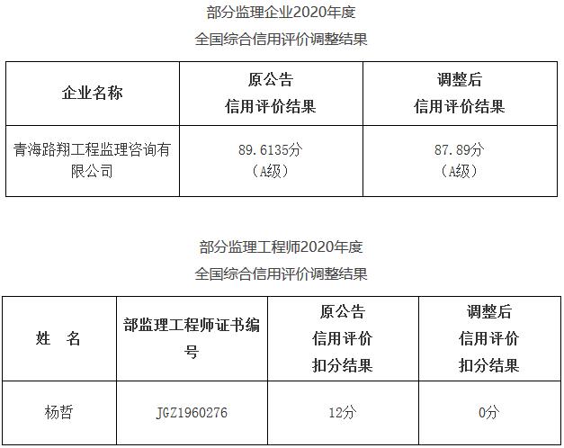 根据《公路水运工程监理信用评价办法》(交质监发〔2012〕774号)规定和新疆维吾尔自治区交通运输厅《关于撤销监理工程师杨哲信用评价扣分和调整青海路翔工程监理咨询有限公司信用评分有关情况的报告》,交通运输部对部分公路监理企业和监理工程师2020年度全国综合信用评价结果进行调整,现予公布。