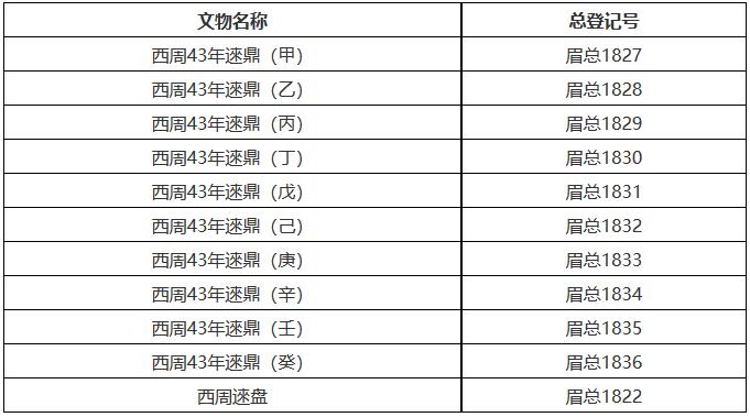 一、同意所报西周四十三年逨鼎(甲)(总登记号:眉总 1827)等11件馆藏一级文物(清单见附件)复制拓印事项。复制数量各1件,拓印数量各2件,用于国内博物馆借展及本馆研究、展示。