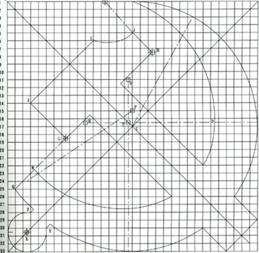 1 将一正方形分为32等分,分格线条编号为横向1~33,竖向1′~33′。画出对角线ac、bd。