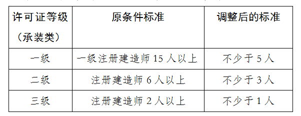 1. 对承装类承装(修、试)电力设施许可证申请条件中要求的电力相关专业注册建造师数量进行如下调整: