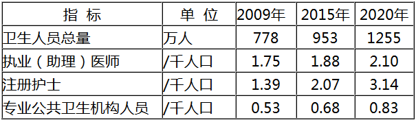 ——医药卫生人才资源总量稳步增长。到2015年,卫生人员总量达到953万人,比2009年增长175万人;到2020年,卫生人员总量达到1255万人,比2015年增长302万人,人才规模基本满足我国人民群众健康服务需求。