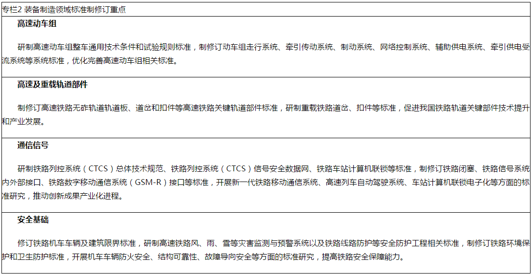 装备制造领域。加强基础安全、移动装备、基础设施、通信信号等相关产品标准的研制力度,重点开展高速动车组、高速及重载铁路轨道部件、列车运行控制以及系统间接口等关键核心技术标准的制修订,发挥标准在装备制造领域的支撑和引领作用。