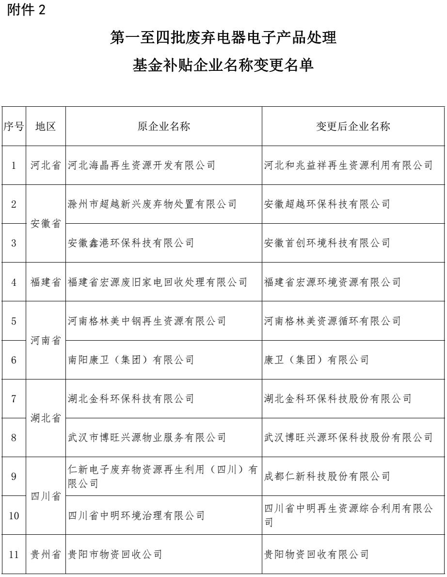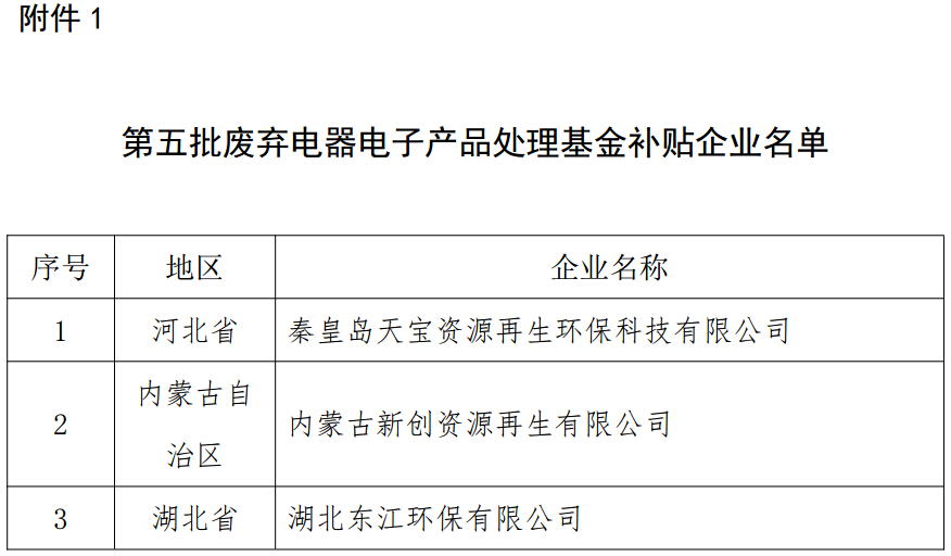 根据财政部、环境保护部、国家发展改革委、工业和信息化部、海关总署、国家税务总局关于印发《废弃电器电子产品处理基金征收使用管理办法》的通知(财综〔2012〕34号)的规定,现公布第五批纳入废弃电器电子产品处理基金补贴范围的企业名单,以及纳入第一至第四批废弃电器电子产品处理基金补贴的企业名称变更名单,请遵照执行。
