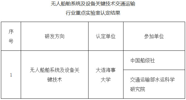 交通运输部关于公布无人船舶系统及设备关键技术交通运输行业重点实验室认定结果的通知