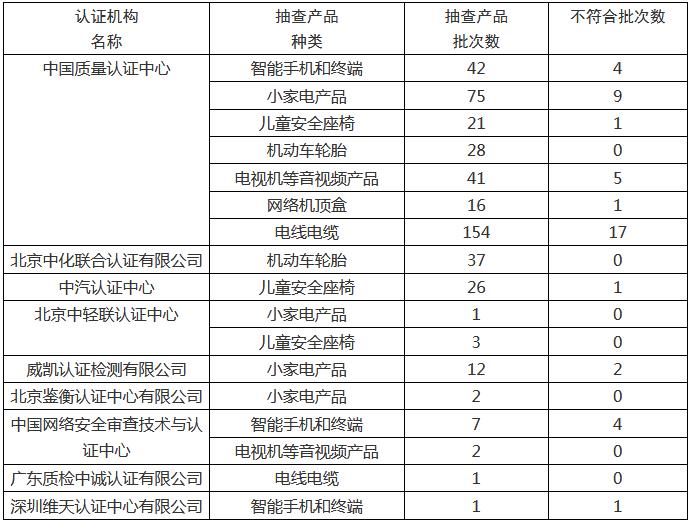 有关认证机构涉及的抽查产品种类、批次数、不符合批次数详见下表。