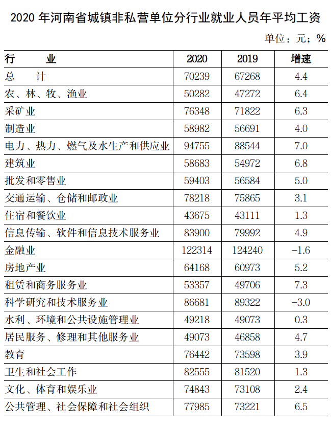 2020年河南省城镇非私营单位就业人员年平均工资70239元
