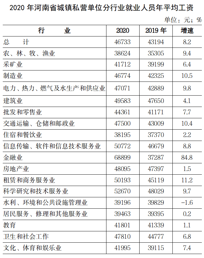 2020年河南省城镇私营单位就业人员年平均工资46733元
