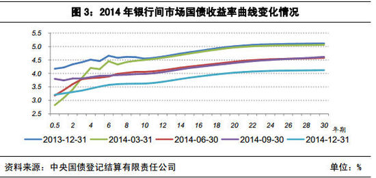 2014 年银行间市场国债收益率曲线整体大幅下移。12 月末,国债收益率曲线 1 年、3 年、5 年、7 年、10 年期收益率较去年末分别下降 96 个、105 个、95 个、98 个、93 个基点,10 年期与 1年期国债期限利差为 36 个基点,较去年末扩大 3 个基点。