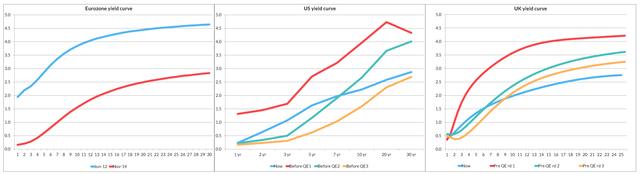 欧元区目前处在经济周期中非常不同的阶段。当美国和英国启动量化宽松的时候,它们各自的十年期借款成本分别在4%和3.5%左右。目前,欧元区的这个指标只有1.5%。在欧洲央行于2012年承诺会“尽一切努力挽救欧元”之后,欧元区的借款成本一直在下降——意大利的借款成本下跌4%,西班牙接近5%,葡萄牙的跌幅超过7%。下图的收益率曲线比较可以显示出,欧元区实际上一直在进行大规模的流动性干预,使得曲线的走向和美国和英国的情况类似。