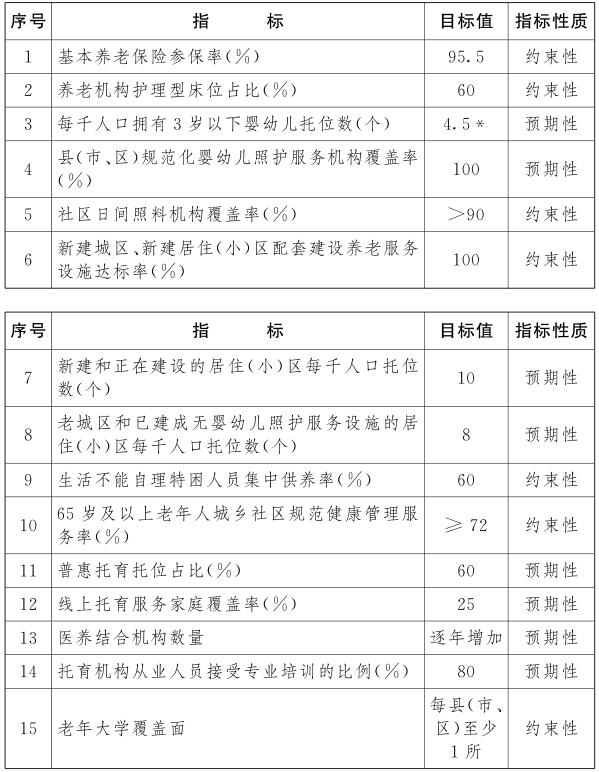 ——养老服务形成覆盖城乡、惠及全民、均衡合理、优质高效的新格局,基本养老保险参保率达到95.5%,养老机构护理型床位占比达到60%,居家社区机构相协调、医养康养相结合的养老服务体系基本形成。