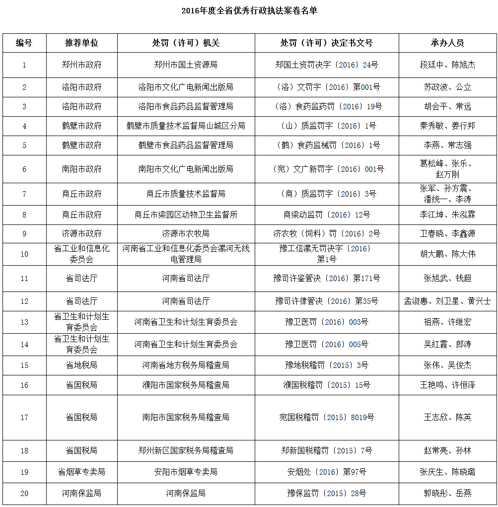 根据《河南省全面推进依法行政工作领导小组办公室关于开展2016年度优秀行政执法案卷评选工作的通知》(豫依法行政领办〔2016〕18号)的要求,我办组织开展了全省2016年度优秀行政执法案卷评选活动。全省77个单位(18个省辖市政府、10个省直管县市政府、43个省直行政执法部门、6个中央部门驻豫执法机构)共推荐参评行政执法案卷491卷。按照公开、公平、公正的原则,20卷行政执法案卷被评为优秀行政执法案卷(名单见附件),现予以通报表扬。