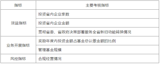 (一)效益指标主要考核私募股权投资(管理)机构所管理的基金对我省企业培育发展的促进和带动作用,主要指标有投资省内企业家数、投资省内企业金额以及贯彻省委、省政府决策部署支持服务我省新旧动能转换情况。
