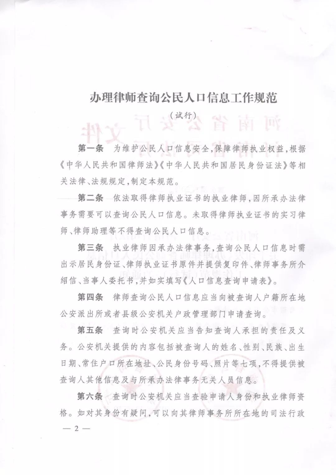 《河南省公安厅河南省司法厅关于印发〈办理律师查询公民人口信息工作规范(试行)〉的通知》