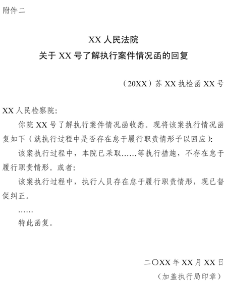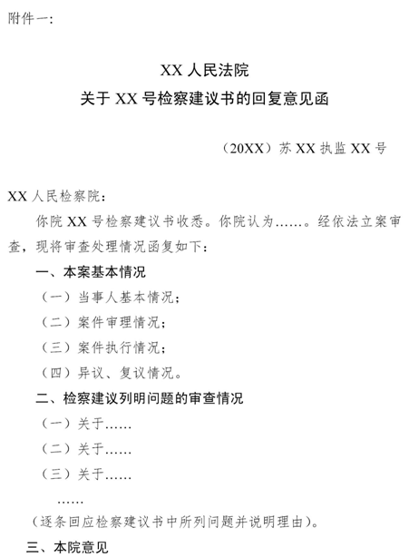 15. 民事执行检察监督案件的审查处理情况,应当以《回复意见函》(见附件一)形式回复提出检察建议或者跟进监督的检察机关。《回复意见函》应当编立执行监督案件案号,载明人民法院查明的事实、回复意见和理由并加盖院章。采纳检察建议的,应当附相关执行裁定、决定等法律文书。必要时,可随函附上相关证据材料。