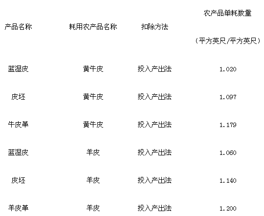 (二)上述产品所属行业范围按照《国民经济行业分类》(GB/T4754-2011)“皮革鞣制加工”(代码:C1910)执行,耗用农产品为黄牛皮或羊皮,未按皮革鞣制加工业登记但实际从事该行业生产的纳税人也属于试点范围。