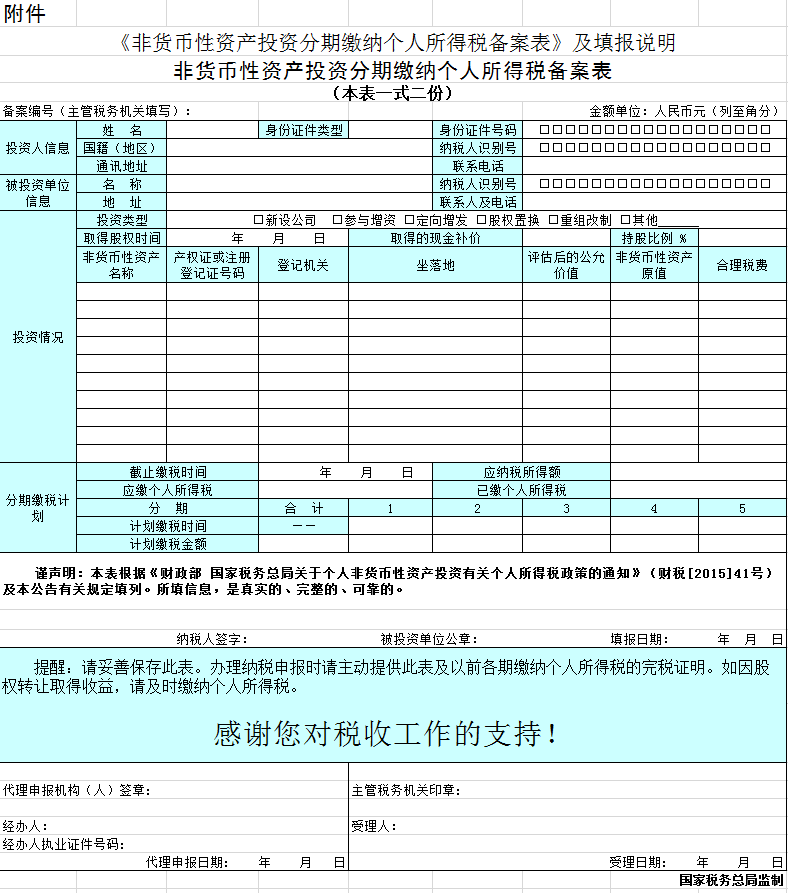 附件:《非货币性资产投资分期缴纳个人所得税备案表》及填报说明