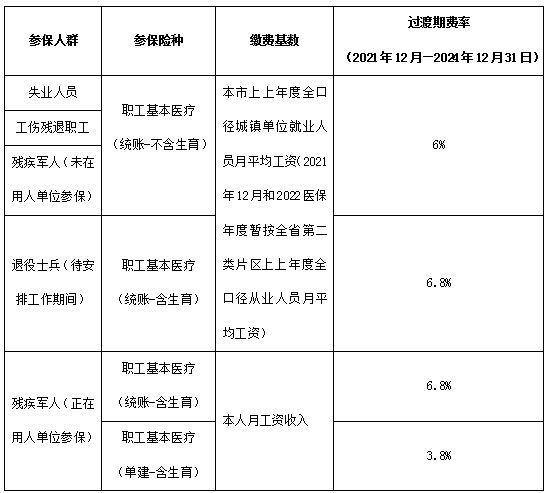 | 退休人员 | 已一次性缴纳基本医疗保险费 | 不参加补充医疗保险;或已一次性缴纳补充医疗保险费 | 不再缴纳医疗保险费,直接享受对应医疗保险待遇。 | |