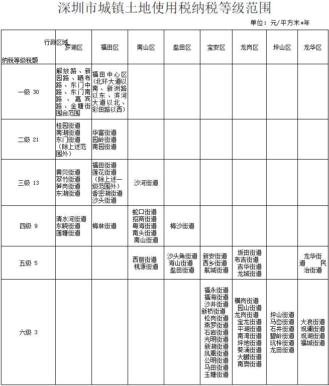 根据《中华人民共和国城镇土地使用税暂行条例》和《广东省城镇土地使用税实施细则》的规定,针对深圳市获批设立龙华区、坪山区2个行政区以及新增航城街道等17个街道的情况,现对深圳市城镇土地使用税纳税等级范围进行调整,具体公告如下: