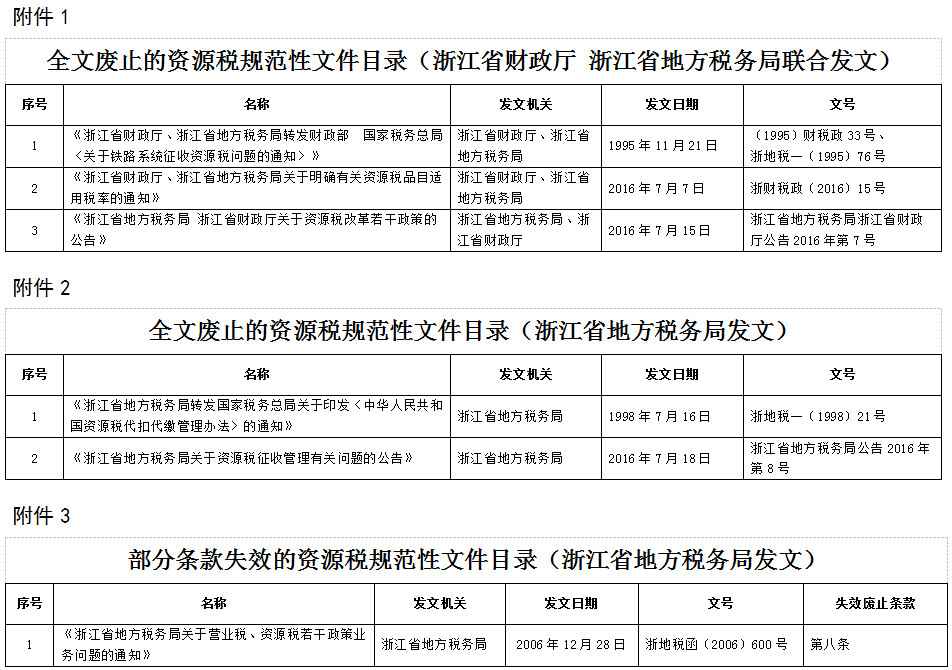 为贯彻落实《中华人民共和国资源税法》,国家税务总局浙江省税务局与浙江省财政厅对依据《中华人民共和国资源税暂行条例》及其实施细则等制发的资源税规范性文件进行了全面清理,共清理出全文废止规范性文件5件,部分条款失效规范性文件1件,现予以公布(具体目录见附件)。